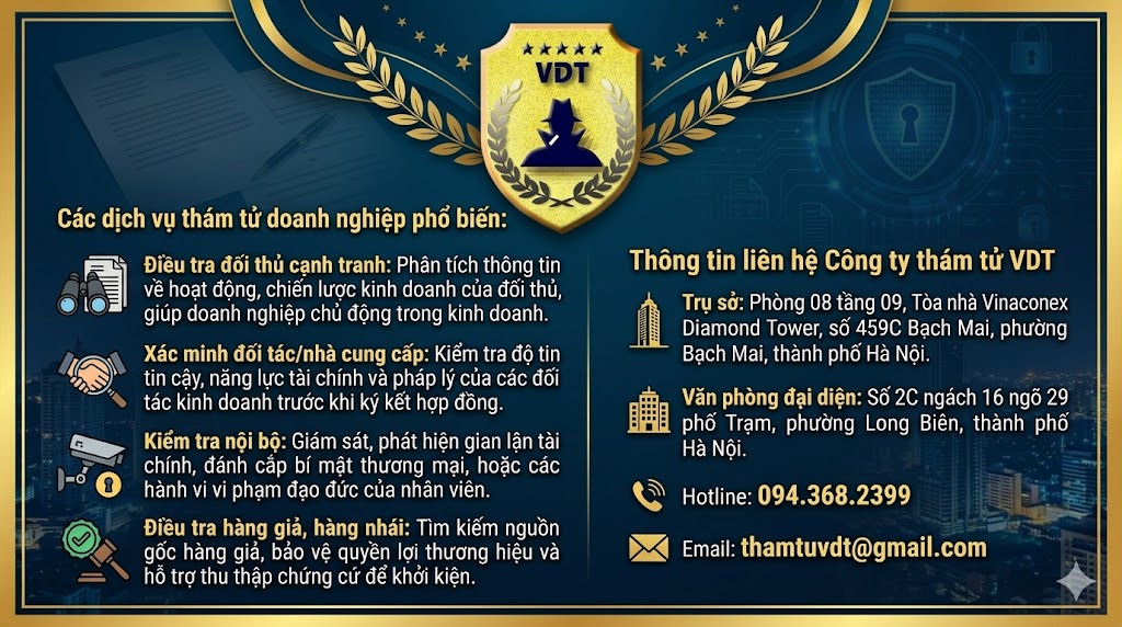 Công ty Thám Tử VDT là một trong những công ty thám tử uy tín và chuyên nghiệp hàng đầu tại Việt Nam. Với đội ngũ thám tử giàu kinh nghiệm, được đào tạo bài bản và trang bị các công nghệ hiện đại, VDT cam kết cung cấp cho khách hàng những dịch vụ thám tử chất lượng cao, đáp ứng mọi nhu cầu.