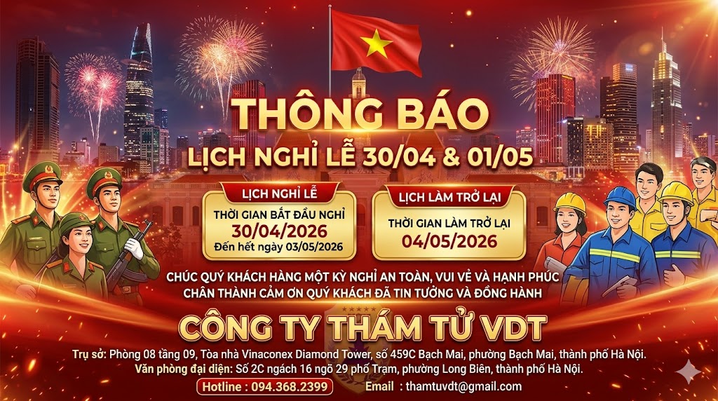 CÔNG TY THÁM TỬ VDT ( V/v : Thông báo lịch làm việc ngày 30/4 và 1/5/2020 ) Kính thưa quý Khách Hàng ! Nhân ngày